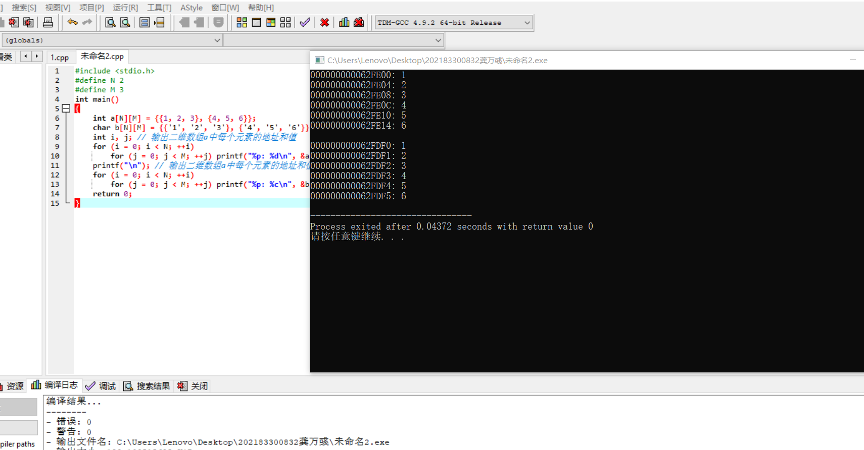#include <stdio.h> #define N 2 #define M 3 int main() { int a[N][M] = {{1, 2, 3}, {4, 5, 6}}; char b[N][M] = {{'1', '2', '3'}, {'4', '5', '6'}}; int i, j; // 输出二维数组a中每个元素的地址和值 for (i = 0; i < N; ++i) for (j = 0; j < M; ++j) printf("%p: %d\n", &a[i][j], a[i][j]); printf("\n"); // 输出二维数组a中每个元素的地址和值 for (i = 0; i < N; ++i) for (j = 0; j < M; ++j) printf("%p: %c\n", &b[i][j], b[i][j]); return 0; }