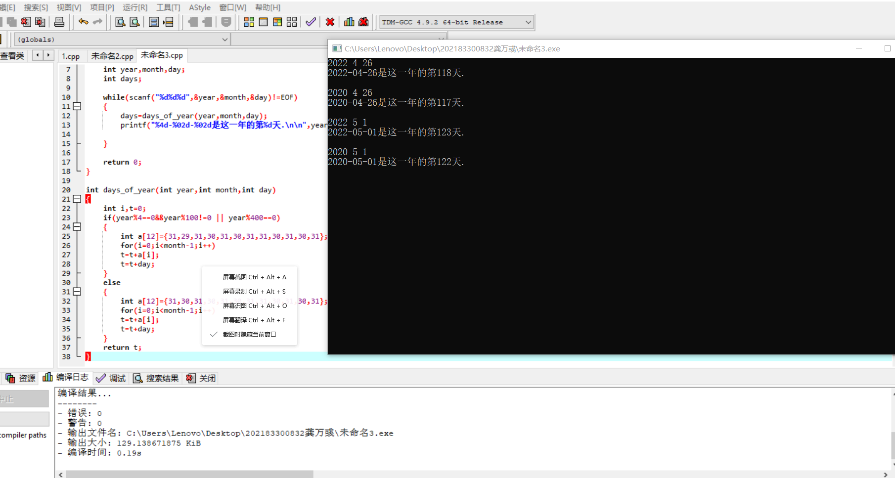 #include <stdio.h> int days_of_year(int year,int month,int day); int main() { int year,month,day; int days; while(scanf("%d%d%d",&year,&month,&day)!=EOF) { days=days_of_year(year,month,day); printf("%4d-%02d-%02d是这一年的第%d天.\n\n",year,month,day,days); } return 0; } int days_of_year(int year,int month,int day) { int i,t=0; if(year%4==0&&year%100!=0 || year%400==0) { int a[12]={31,29,31,30,31,30,31,31,30,31,30,31}; for(i=0;i<month-1;i++) t=t+a[i]; t=t+day; } else { int a[12]={31,30,31,30,31,30,31,31,30,31,30,31}; for(i=0;i<month-1;i++) t=t+a[i]; t=t+day; } return t; }