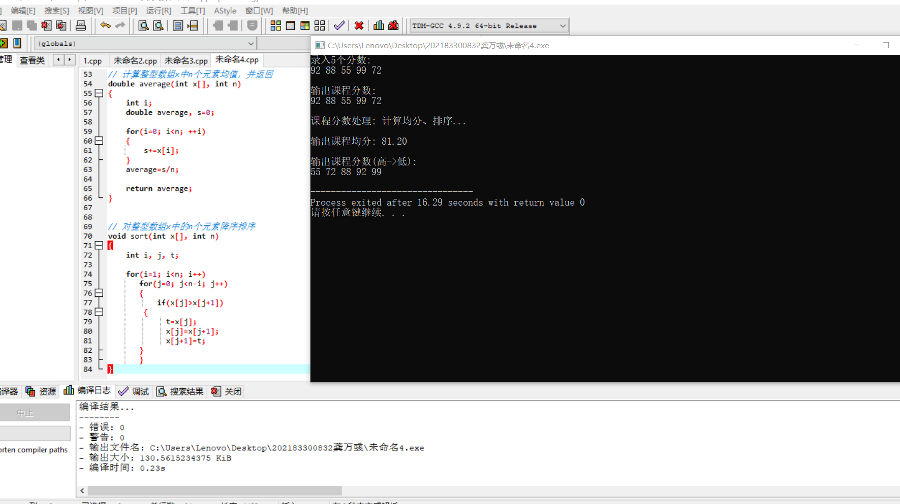 #include <stdio.h> #define N 5 // 函数声明 void input(int x[], int n); void output(int x[], int n); double average(int x[], int n); void sort(int x[], int n); int main() { int scores[N]; double ave; printf("录入%d个分数:\n", N); input(scores, N); printf("\n输出课程分数: \n"); output(scores, N); printf("\n课程分数处理: 计算均分、排序...\n"); ave = average(scores, N); sort(scores, N); printf("\n输出课程均分: %.2f\n", ave); printf("\n输出课程分数(高->低):\n"); output(scores, N); return 0; } // 函数定义 // 输入n个整数保存到整型数组x中 void input(int x[], int n) { int i; for(i=0; i<n; ++i) scanf("%d", &x[i]); } // 输出整型数组x中n个元素 void output(int x[], int n) { int i; for(i=0; i<n; ++i) printf("%d ", x[i]); printf("\n"); } // 计算整型数组x中n个元素均值,并返回 double average(int x[], int n) { int i; double average, s=0; for(i=0; i<n; ++i) { s+=x[i]; } average=s/n; return average; } // 对整型数组x中的n个元素降序排序 void sort(int x[], int n) { int i, j, t; for(i=1; i<n; i++) for(j=0; j<n-i; j++) { if(x[j]>x[j+1]) { t=x[j]; x[j]=x[j+1]; x[j+1]=t; } } }