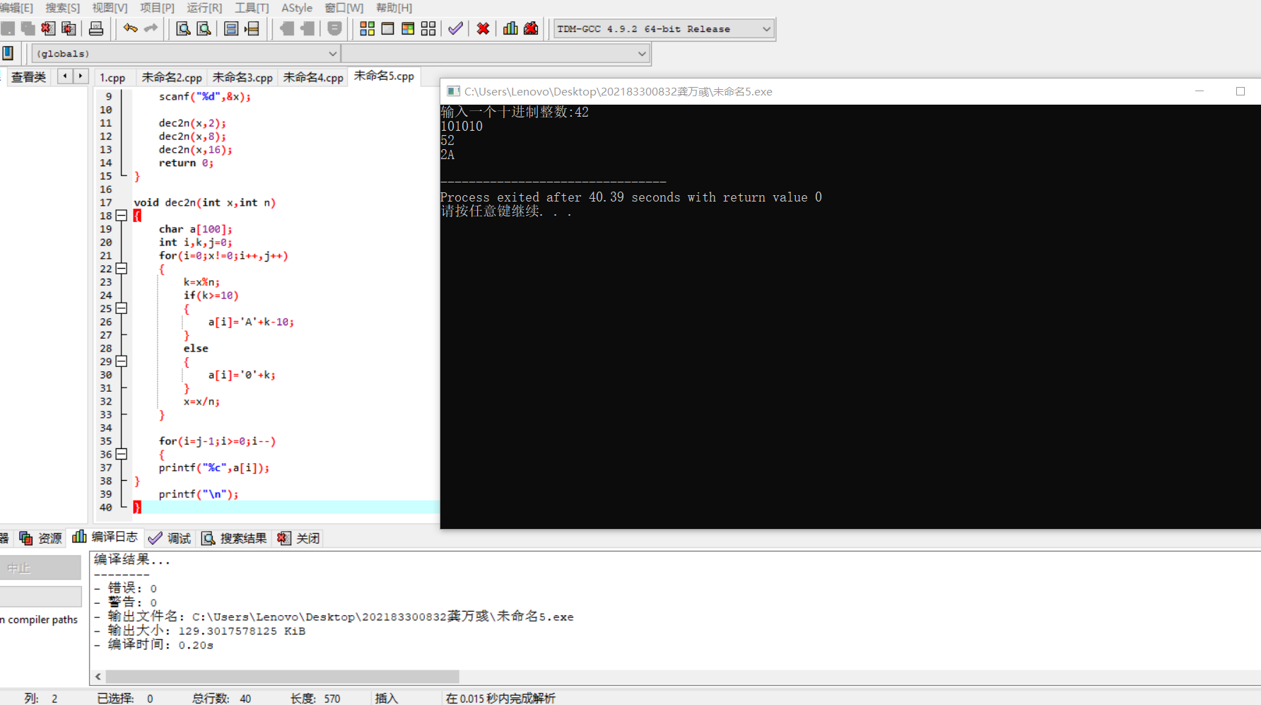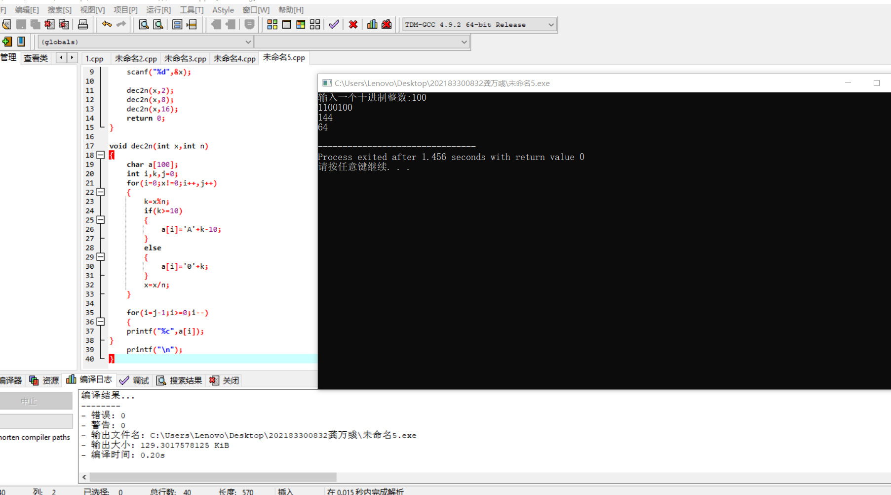 #include <stdio.h> void dec2n(int x,int n); int main() { int x; printf("输入一个十进制整数:"); scanf("%d",&x); dec2n(x,2); dec2n(x,8); dec2n(x,16); return 0; } void dec2n(int x,int n) { char a[100]; int i,k,j=0; for(i=0;x!=0;i++,j++) { k=x%n; if(k>=10) { a[i]='A'+k-10; } else { a[i]='0'+k; } x=x/n; } for(i=j-1;i>=0;i--) { printf("%c",a[i]); } printf("\n"); }
