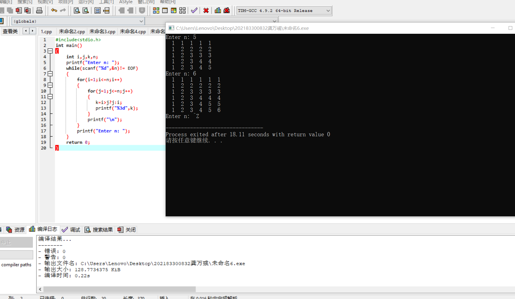 #include<stdio.h> int main() { int i,j,k,n; printf("Enter n: "); while(scanf("%d",&n)!= EOF) { for(i=1;i<=n;i++) { for(j=1;j<=n;j++) { k=i>j?j:i; printf("%3d",k); } printf("\n"); } printf("Enter n: "); } return 0; }