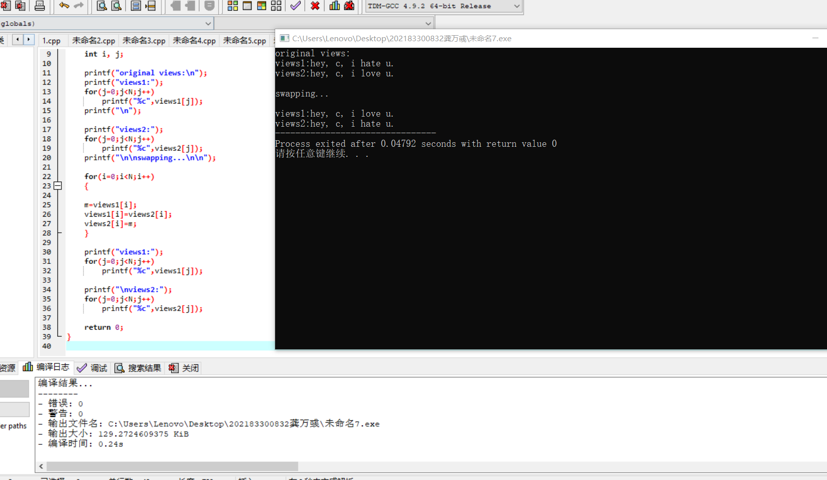 #include <stdio.h> #define N 80 int main() { char views1[N] = "hey, c, i hate u."; char views2[N] = "hey, c, i love u."; char m; int i, j; printf("original views:\n"); printf("views1:"); for(j=0;j<N;j++) printf("%c",views1[j]); printf("\n"); printf("views2:"); for(j=0;j<N;j++) printf("%c",views2[j]); printf("\n\nswapping...\n\n"); for(i=0;i<N;i++) { m=views1[i]; views1[i]=views2[i]; views2[i]=m; } printf("views1:"); for(j=0;j<N;j++) printf("%c",views1[j]); printf("\nviews2:"); for(j=0;j<N;j++) printf("%c",views2[j]); return 0; }