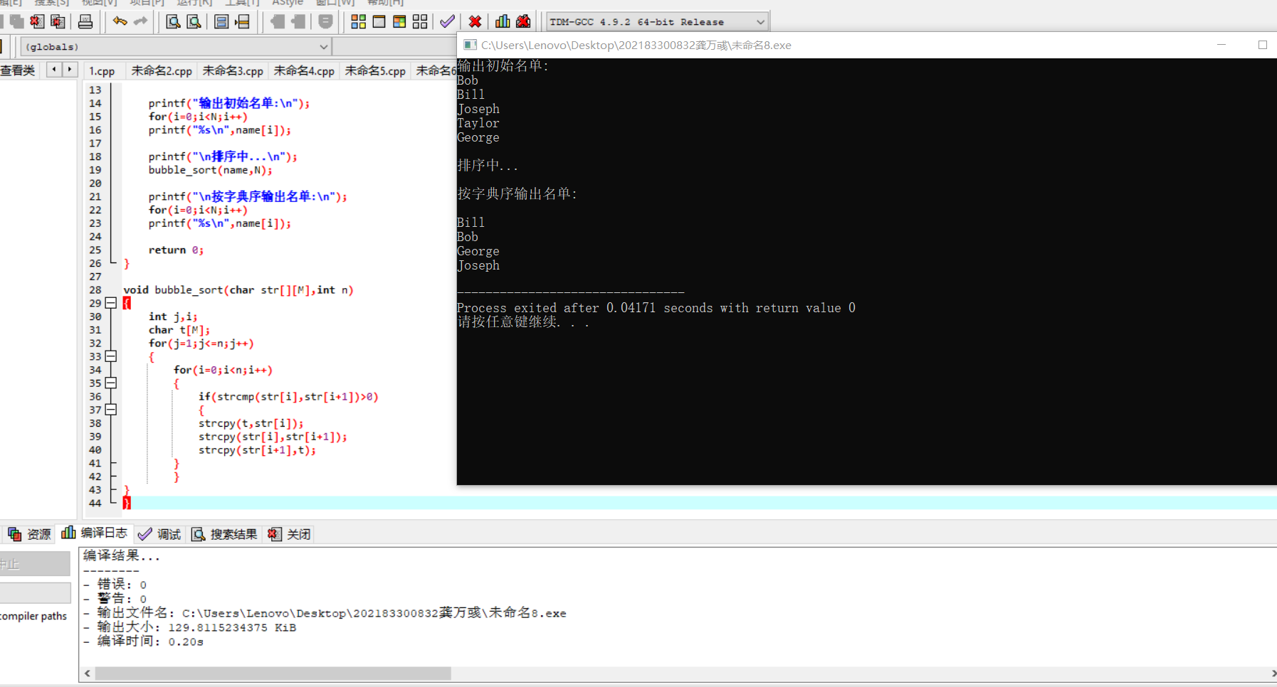 #include <stdio.h> #include <string.h> #define N 5 #define M 20 void bubble_sort(char str[][M],int n); int main() { char name[][M]={"Bob","Bill","Joseph","Taylor","George"}; int i; printf("输出初始名单:\n"); for(i=0;i<N;i++) printf("%s\n",name[i]); printf("\n排序中...\n"); bubble_sort(name,N); printf("\n按字典序输出名单:\n"); for(i=0;i<N;i++) printf("%s\n",name[i]); return 0; } void bubble_sort(char str[][M],int n) { int j,i; char t[M]; for(j=1;j<=n;j++) { for(i=0;i<n;i++) { if(strcmp(str[i],str[i+1])>0) { strcpy(t,str[i]); strcpy(str[i],str[i+1]); strcpy(str[i+1],t); } } } }