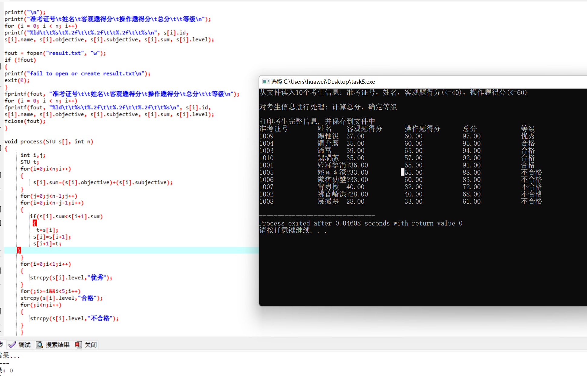 printf("从文件读入%d个考生信息: 准考证号,姓名,客观题得分(<=40),操作题得分(<=60)\n", N);