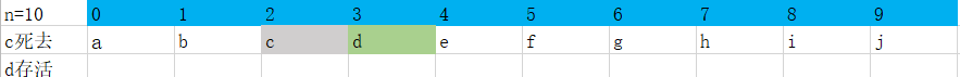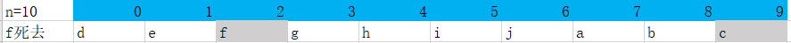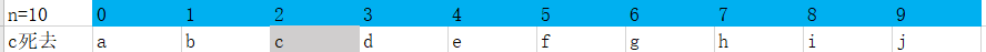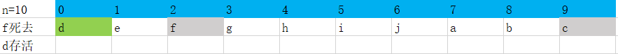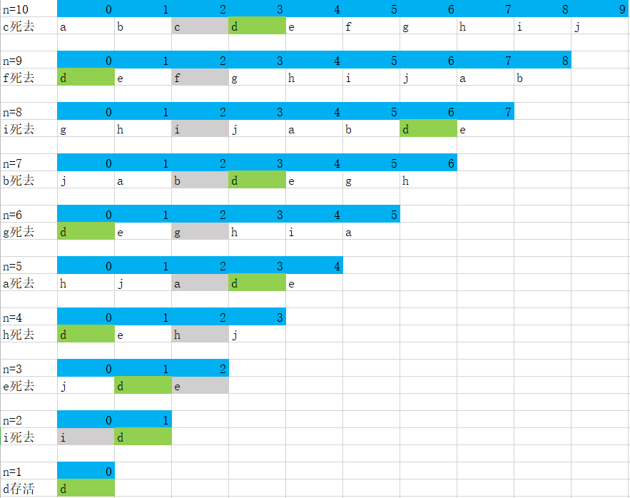 最后我们可以知道d最终存活了下来,设f(n) = x 表示有n个人时存活下来的是x,这里f(10)=d。