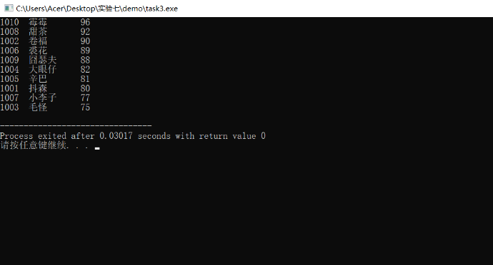 // 从文本数据文件file1.dat中读入数据,按成绩从高到低排序,将排序结果输出到屏幕上,同时以文本方式存入文件file3.dat中。