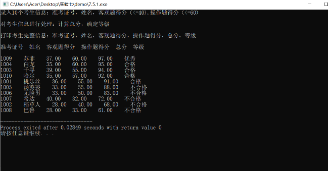 printf("\n打印考生完整信息:准考证号,姓名,客观题得分,操作题得分,总分,等级\n");