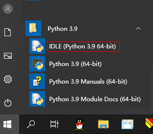 如上图,在开始菜单,找到python安装目录,找到第一个菜单:IDLE(Python 3.9 64-bit),就可以打开官方的开发工具IDLE Shell