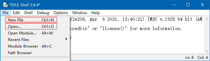 当然这个IDLE shell是以行命令来编写代码,我们更多情况是写多行代码来编译运行,你可以点“File”菜单,再点第一个子菜单“New File”来创建一个新的文件;如果你早就创建了一个.py文件,也可以点第二个子菜单“Open…”,打开你的py文件。