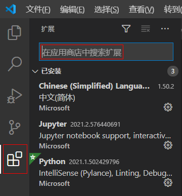 安装好vscode后,打开它,发现它默认的语言还是英文,我们先将tkinter汉化,变成中文界面(如上图),在打开的界面的左边活动栏里,点击最下面那个4个小方块图标,在出现的应用商店搜索栏里,输入 Chinese 搜索,出现“Chinese(Simplified) Langua…”,安装这个扩展插件,就可以成功把vscode界面变成中文。