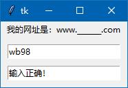 1 from tkinter import * 2 3 def callback1(): 4 if en1.get()=='wb98': 5 en2.delete(0,END) 6 en2.insert(END,'输入正确!') 7 return True 8 else: 9 en2.delete(0,END) 10 en2.insert(END,'输入错误,正确答案是:wb98') 11 return False 12 13 def callback2(): 14 print('因为你输入错误,我被调用了') 15 16 root=Tk() 17 18 la1=Label(root,text='我的网址是:www._______.com') 19 la1.pack() 20 21 en1=Entry(root,validate='focusout',validatecommand=callback1,invalidcommand=callback2) 22 en1.pack(padx=10,pady=(10,0),ipadx=10) 23 24 en2=Entry(root) 25 en2.pack(padx=10,pady=10,ipadx=10) 26 27 root.mainloop()