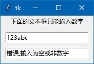 def callback1(): if (en1.get()).isdigit(): # 用isdigit()来判断是否是数字 en2.delete(0,END) en2.insert(END,'输入正确!') return True else: en2.delete(0,END) en2.insert(END,'错误,输入为空或非数字') return False