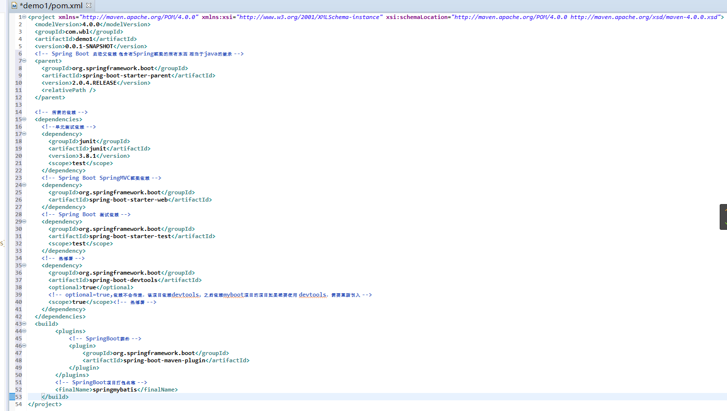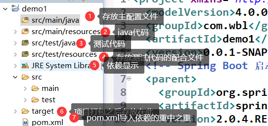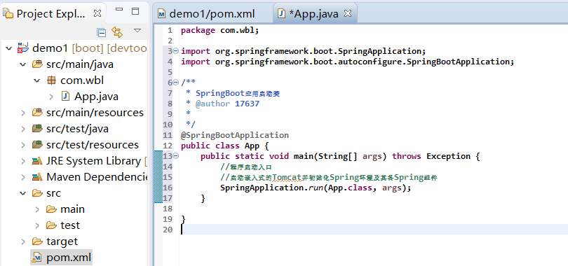 5、创建SpringBoot入口函数在项目src/main/java目录下的com.wbl包中随意创建一个带有main()方法的类(例如:类名App,在里面加注释@SpringBootApplication,并在main()的方法中添加SpringApplication.run(类名.class,args)。此时该类为SpringBoot的入口函数,即运行App即可
