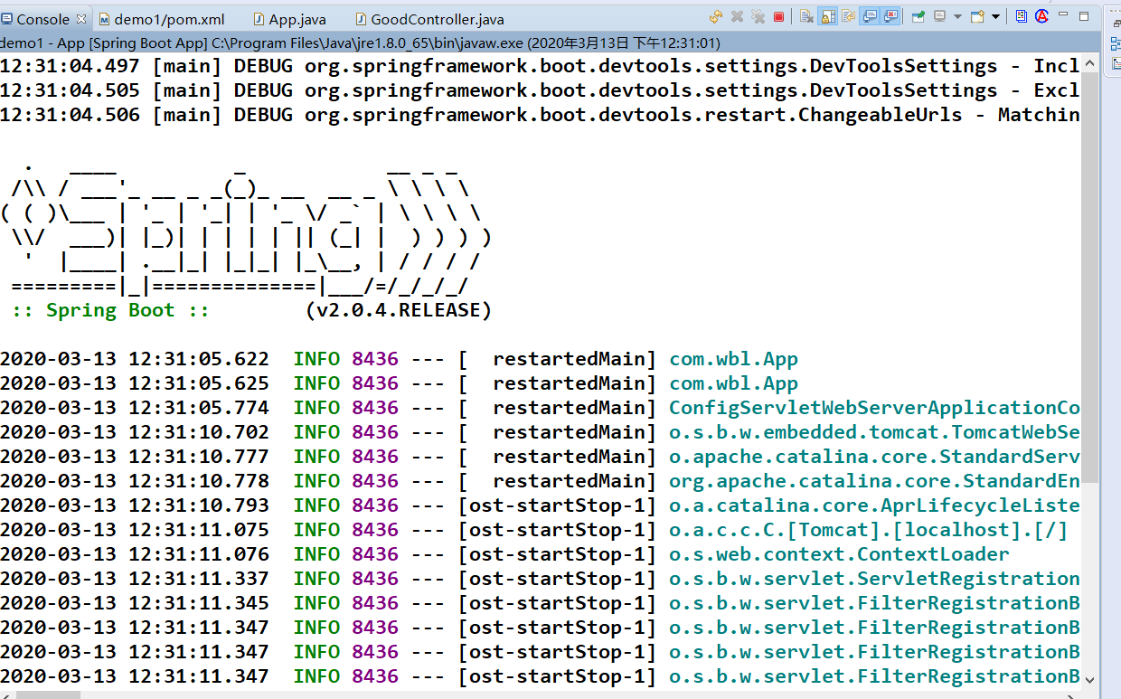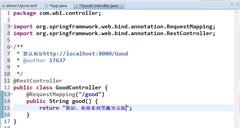 6、创建控制器在主模块包(com.wbl.controller)或者其子包创建控制器类(例如:GoodController类)并注解@RestController,该注解的作用相当于我们原来使用的@Controller+@ResponseBody合到一起的作用,在该类中写一个处理请求的方式并通过注解@RequestMapping指定访问的路径