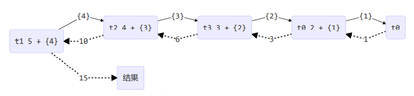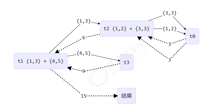 任务之间相互依赖,当被依赖的任务结果求出,自己这个任务的结果才能求出,效率不高,如下图: