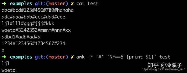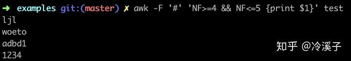 关系运算模式:awk -F '#' 'NF==5 {print $1}' test