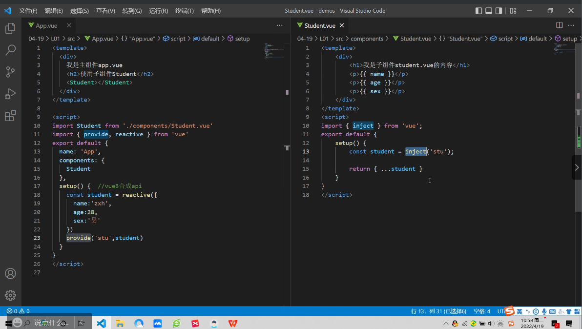 <template> <div> 我是主组件app.vue <h2>使用子组件Student</h2> <Student></Student> </div> </template> <script> import Student from "./components/Student.vue"; import { provide,reactive} from 'vue' export default { name: 'App', components: { Student }, setup(){ //vue合成api const student=reactive({ naem:'zxh', age:28, sex:'男' }) provide('stu',student) } } </script>