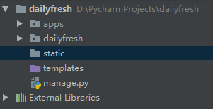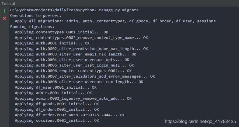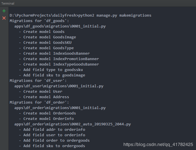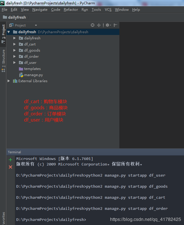 1.在PyCharm中创建dailyfresh项目,然后再到终端中创建项目应用模块,如下图所示