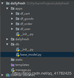 7.在项目目录下创建一个名为db的python包,在这个包下创建一个base_model.py文件,用作于基类完成数据库表共有字段