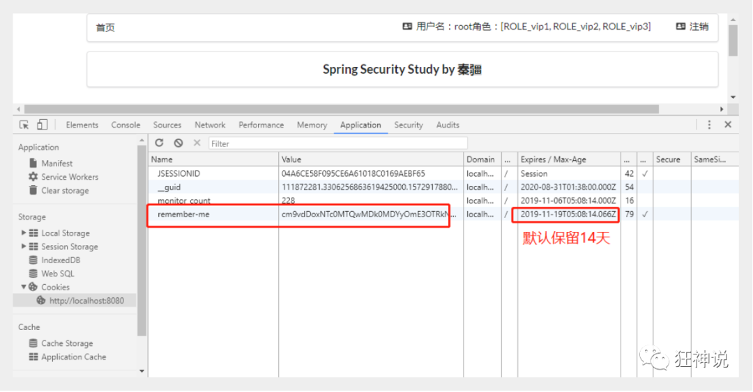 //定制请求的授权规则 @Override protected void configure(HttpSecurity http) throws Exception { //。。。。。。。。。。。 //记住我 http.rememberMe(); }