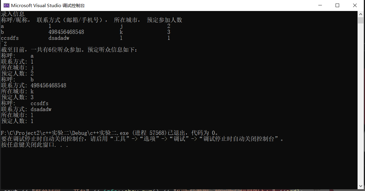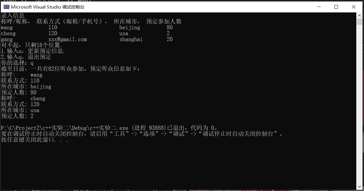 #include <iostream> #include <vector> #include "info.hpp" int main() { using namespace std; vector<info>audience_info_list;//定义了一个元素是info对象的数组 const int capacity = 100;//初始化 //录入信息 cout << "录入信息" << endl; cout << "称呼/昵称, 联系方式(邮箱/手机号), 所在城市, 预定参加人数" << endl; string nickname, contact, city; int n = 0; int total = 0;//记录总共的观众人数 while (cin >> nickname >> contact >> city >> n) { if (total + n > 100) { cout << "对不起,只剩" << capacity - total << "个位置." << endl; cout << "1.输入u,更新预定信息." << endl; cout << "2.输入q,退出预定" << endl; cout << "你的选择:"; char c; cin >> c; if (c == 'q') break; else continue; } total += n; info m(nickname, contact, city, n);//定义一个对象 audience_info_list.push_back(m);//在尾部插入元素 } cout << "截至目前,一共有" << info::show_num() << "位听众参加。预定听众信息如下:" <<endl; for (auto i : audience_info_list)//用i遍历容器audience_info_list中的值 { i.print(); } }