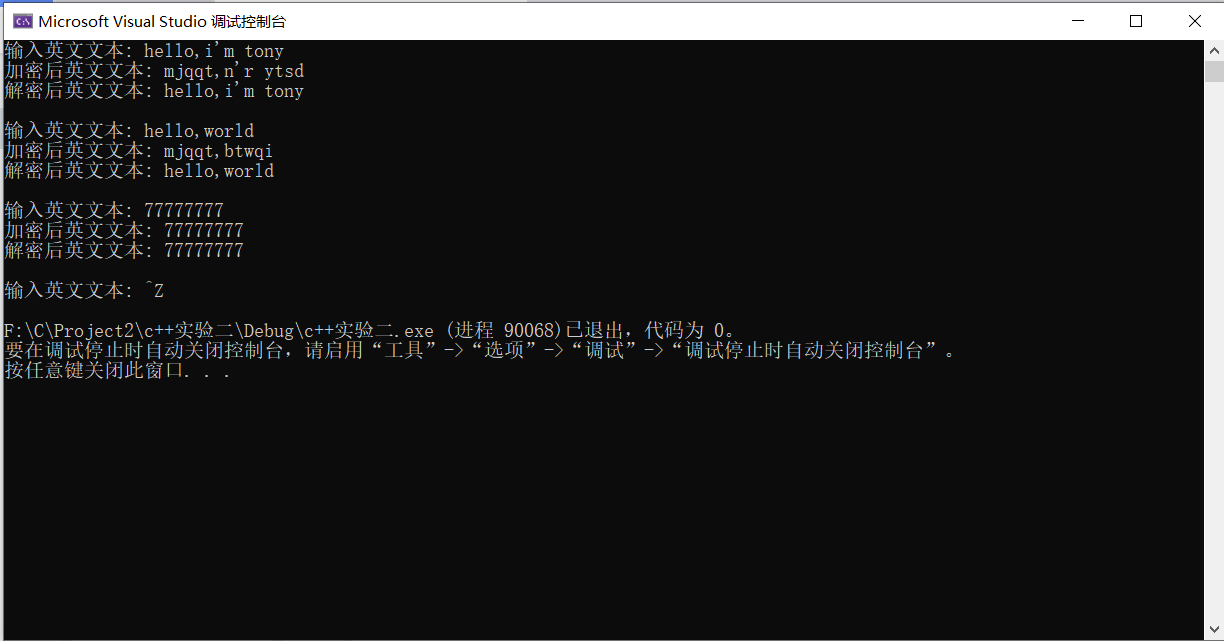 #include "TextCoder.hpp" #include <iostream> #include <string> int main() { using namespace std; string text, encoded_text, decoded_text; cout << "输入英文文本: "; while (getline(cin, text)) { encoded_text = TextCoder(text).encoder(); // 这里使用的是临时无名对象 cout << "加密后英文文本:\t" << encoded_text << endl; decoded_text = TextCoder(encoded_text).decoder(); // 这里使用的是临时无名对象 cout << "解密后英文文本:\t" << decoded_text << endl; cout << "\n输入英文文本: "; } }
