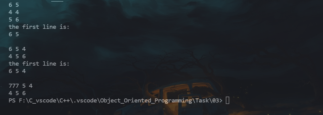 #include <iostream> #include "matrix.hpp" int main() { using namespace std; double x[] = {6, 5, 4, 4, 5, 6}; Matrix m1(3, 2); // 创建一个3×2的矩阵 m1.set(x); // 用一维数组x的值按行为矩阵m1赋值 m1.print(); // 打印矩阵m1的值 cout << "the first line is: " << endl; cout << m1.at(0, 0) << " " << m1.at(0, 1) << endl; cout << endl; Matrix m2(2, 3); m2.set(x); m2.print(); cout << "the first line is: " << endl; cout << m2.at(0, 0) << " " << m2.at(0, 1) << " " << m2.at(0, 2) << endl; cout << endl; Matrix m3(m2); m3.set(0, 0, 777); m3.print(); }