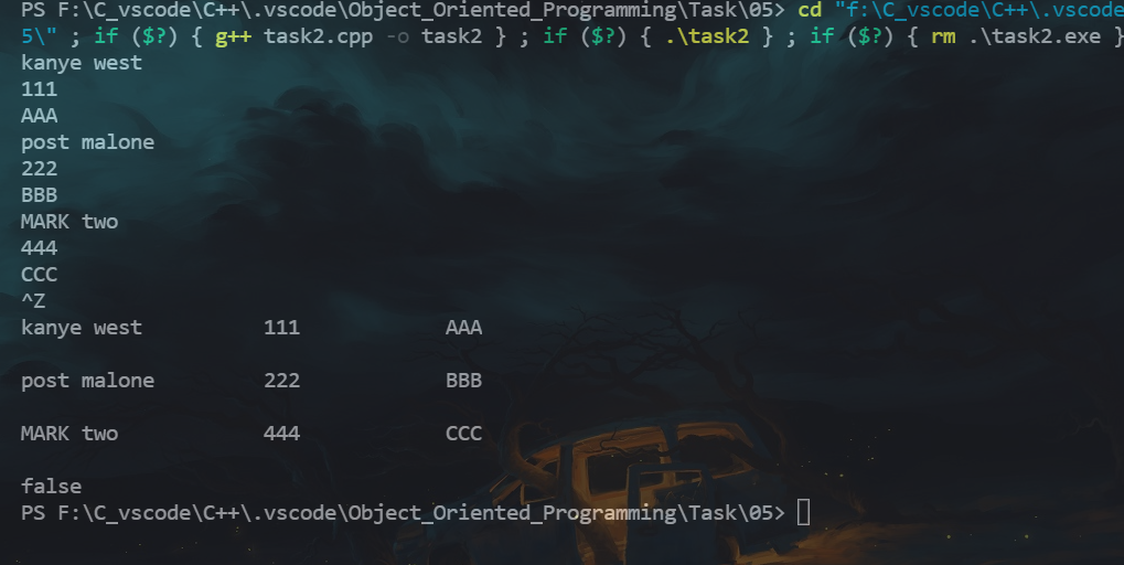 #include <iostream> #include <fstream> #include <vector> #include "Person.hpp" int main() { using namespace std; vector<Person> phone_book; Person p; while(cin>>p) phone_book.push_back(p); for(auto &i: phone_book) cout << i << endl; cout << boolalpha << (phone_book.at(0) == phone_book.at(1)) << endl; ofstream fout; fout.open("phone_book.txt"); if(!fout.is_open()) { cerr << "fail to open file phone_book.txt\n"; return 1; } for(auto &i: phone_book) fout << i << endl; fout.close(); }