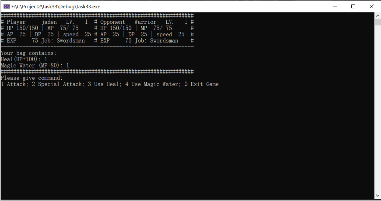 //======================= // main.cpp //======================= // main function for the RPG style game #include <iostream> #include <string> using namespace std; #include "swordsman.h" int main() { string tempName; bool success = 0; //flag for storing whether operation is successful cout << "Please input player's name: "; cin >> tempName; // get player's name from keyboard input player* human = nullptr; // use pointer of base class, convenience for polymorphism int tempJob; // temp choice for job selection do { cout << "Please choose a job: 1 Swordsman, 2 Archer, 3 Mage" << endl; cin >> tempJob; system("cls"); // clear the screen switch (tempJob) { case 1: human = new swordsman(1, tempName); // create the character with user inputted name and job success = 1; // operation succeed break; default: break; // In this case, success=0, character creation failed } } while (success != 1); // so the loop will ask user to re-create a character int tempCom; // temp command inputted by user int nOpp = 0; // the Nth opponent for (int i = 1; nOpp < 5; i += 2) // i is opponent's level { nOpp++; system("cls"); cout << "STAGE" << nOpp << endl; cout << "Your opponent, a Level " << i << " Swordsman." << endl; system("pause"); swordsman enemy(i, "Warrior"); // Initialise an opponent, level i, name "Junior" human->reFill(); // get HP/MP refill before start fight while (!human->death() && !enemy.death()) // no died { success = 0; while (success != 1) { showinfo(*human, enemy); // show fighter's information cout << "Please give command: " << endl; cout << "1 Attack; 2 Special Attack; 3 Use Heal; 4 Use Magic Water; 0 Exit Game" << endl; cin >> tempCom; switch (tempCom) { case 0: cout << "Are you sure to exit? Y/N" << endl; char temp; cin >> temp; if (temp == 'Y' || temp == 'y') return 0; else break; case 1: success = human->attack(enemy); human->isLevelUp(); enemy.isDead(); break; case 2: success = human->specialatt(enemy); human->isLevelUp(); enemy.isDead(); break; case 3: success = human->useHeal(); break; case 4: success = human->useMW(); break; default: break; } } if (!enemy.death()) // If AI still alive enemy.AI(*human); else // AI died { cout << "YOU WIN" << endl; human->transfer(enemy); // player got all AI's items } if (human->death()) { system("cls"); cout << endl << setw(50) << "GAME OVER" << endl; delete human; // player is dead, program is getting to its end, what should we do here? system("pause"); return 0; } } } delete human; // You win, program is getting to its end, what should we do here? system("cls"); cout << "Congratulations! You defeated all opponents!!" << endl; system("pause"); return 0; }