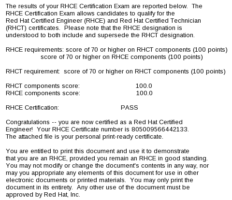 我在本年八月二十八号二十二点四十一分收到红帽那个带有证书附件的考试成绩邮件,从那一刻起我获得了我梦寐以求的RHCE认证。晒一下我的成绩啊