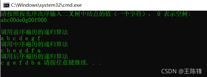 printf("请按照按先序次序输入二叉树中结点的值(一个字符),`0`表示空树:\n");