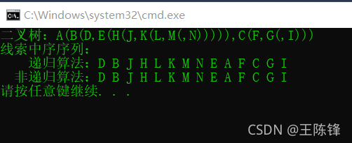 程序采用cpp文件,实现中序线索化二叉树,采用递归和非递归两种方式输出线索中序序列。