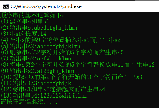 printf("(12)将串s1和串s2连接起来而产生串s4\n");