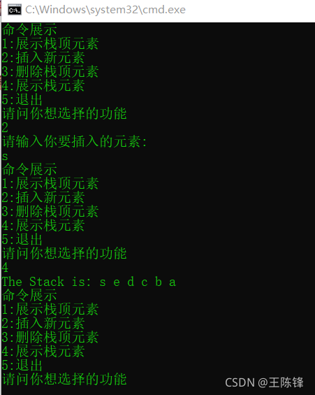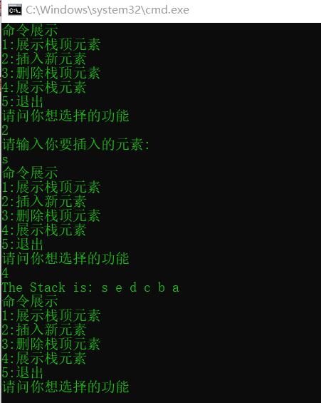 case 1: e=gettop(S);printf("栈顶元素是:%c\n",e);order(S);break;