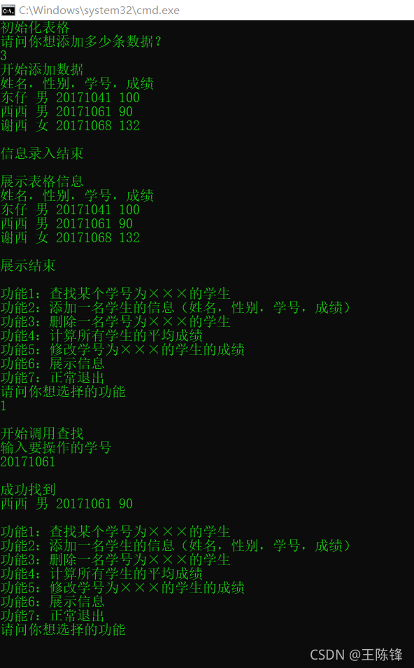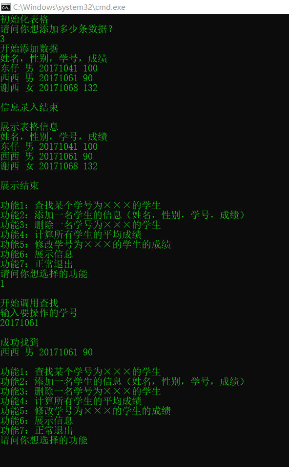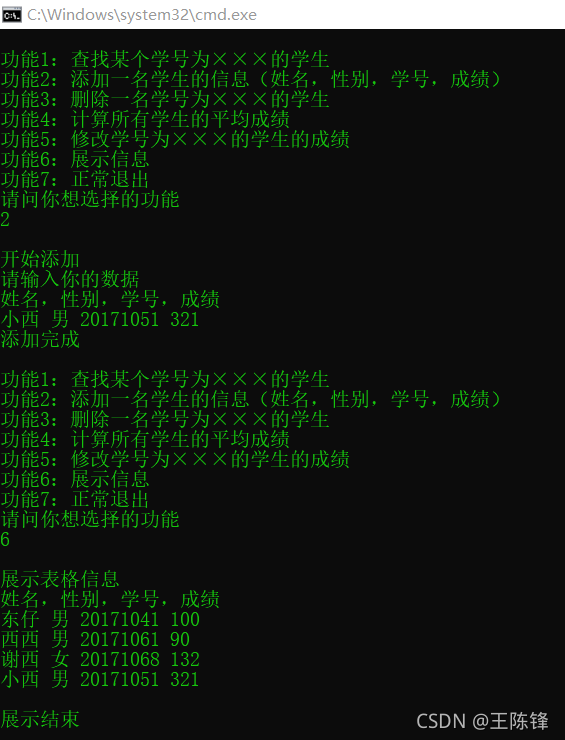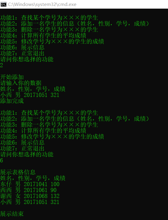 功能2:添加一名学生的信息(姓名,性别,学号,成绩);