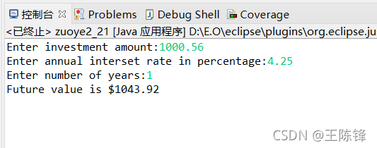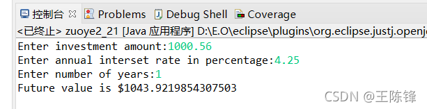 编写程序,读取投资总额、年利率和年数,然后使用下面的公式显示投资回报金额。