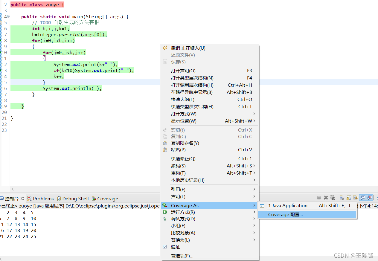 编写程序,实现5*5数字方格输出、7*7数字方格输出。(含在main函数的输入参数中设置)(Eclipse设置参数运行)