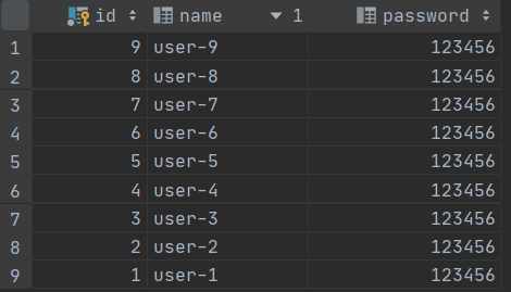 insert into user (id, name, password) values (i,concat('user-',i),'123456');