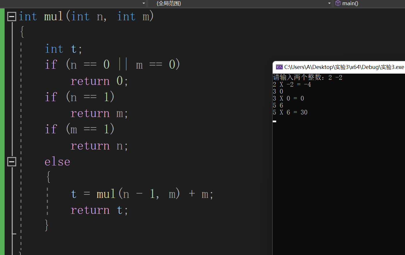 #include <stdio.h> int mul(int n, int m); int main() { int n, m; printf("请输入两个整数:"); while (scanf_s("%d%d", &n, &m) != EOF) printf("%d X %d = %d\n", n, m, mul(n, m)); return 0; } int mul(int n, int m) { int t; if (n == 0 || m == 0) return 0; if (n == 1) return m; if (m == 1) return n; else { t = mul(n - 1, m) + m; return t; } }