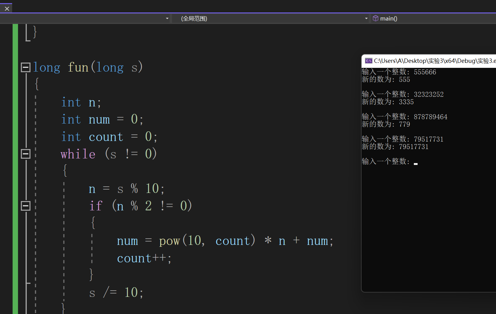 #include <stdio.h> #include <math.h> long fun(long s); int main() { long s, t; printf("输入一个整数: "); while (scanf_s("%ld", &s) != EOF) { t = fun(s); printf("新的数为: %ld\n\n", t); printf("输入一个整数: "); } return 0; } long fun(long s) { int n; int num = 0; int count = 0; while (s != 0) { n = s % 10; if (n % 2 != 0) { num = pow(10, count) * n + num; count++; } s /= 10; } return num; }