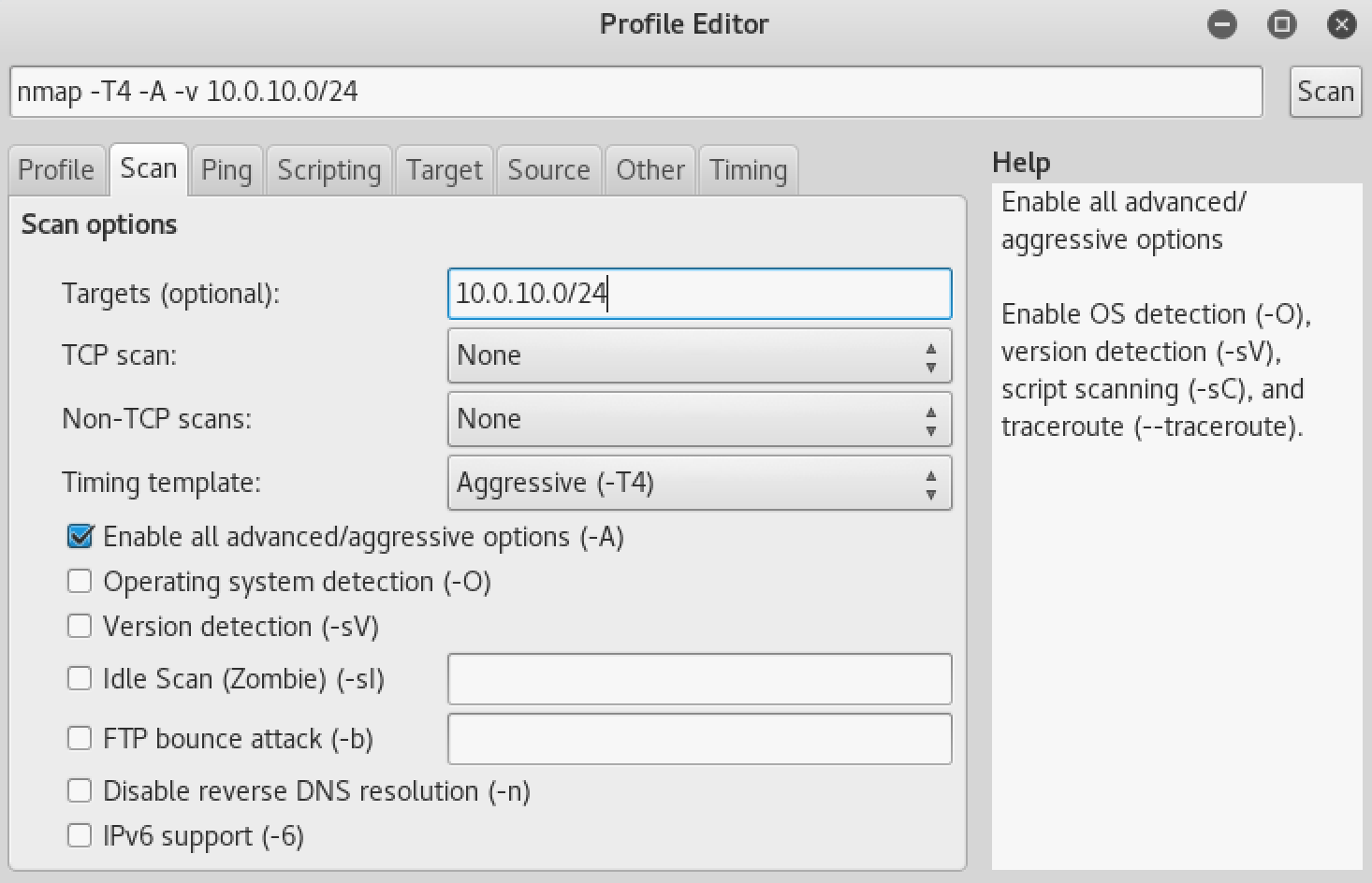 Scan标签:填写IP地址范围10.0.10.0-255或者CIDR格式10.0.10.0/24