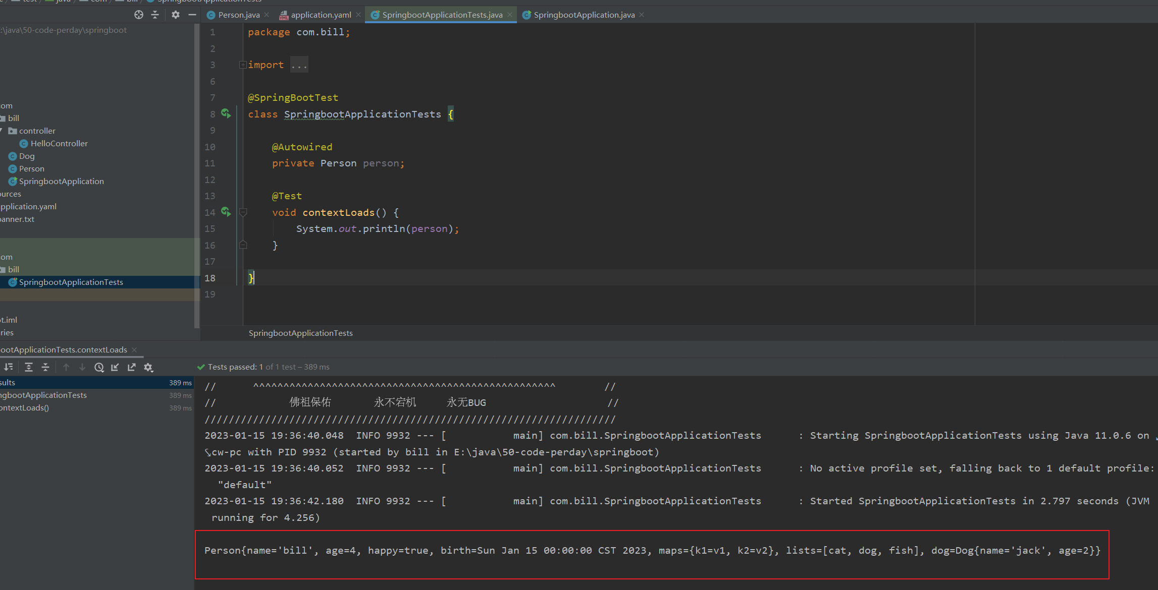 public Person(String name, Integer age, Boolean happy, Date birth, Map<String, Object> maps, List<Object> lists, Dog dog) {