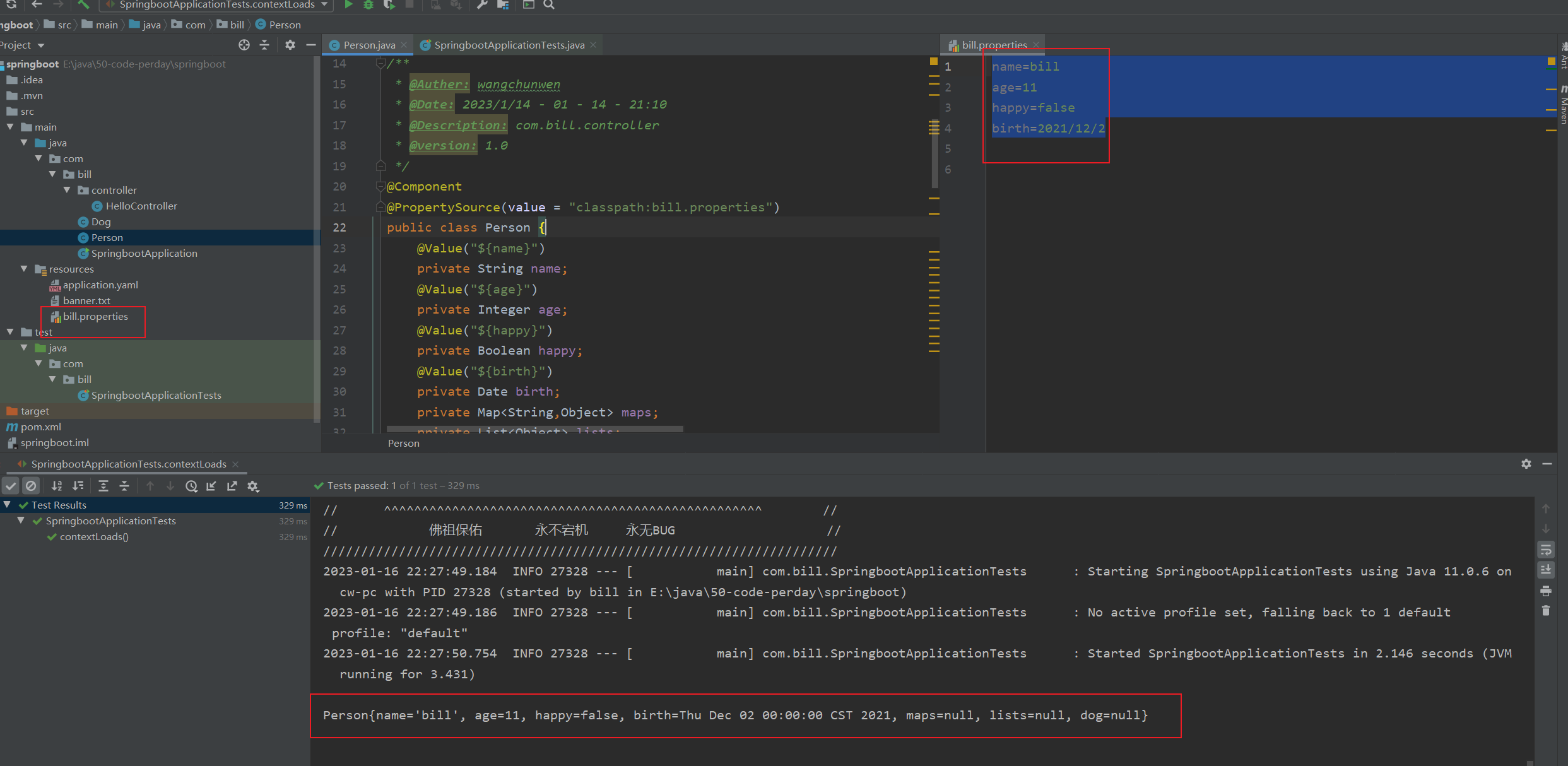 通过@PropertySource注解指定自定义的配置文件@PropertySource(value = "classpath:bill.properties")