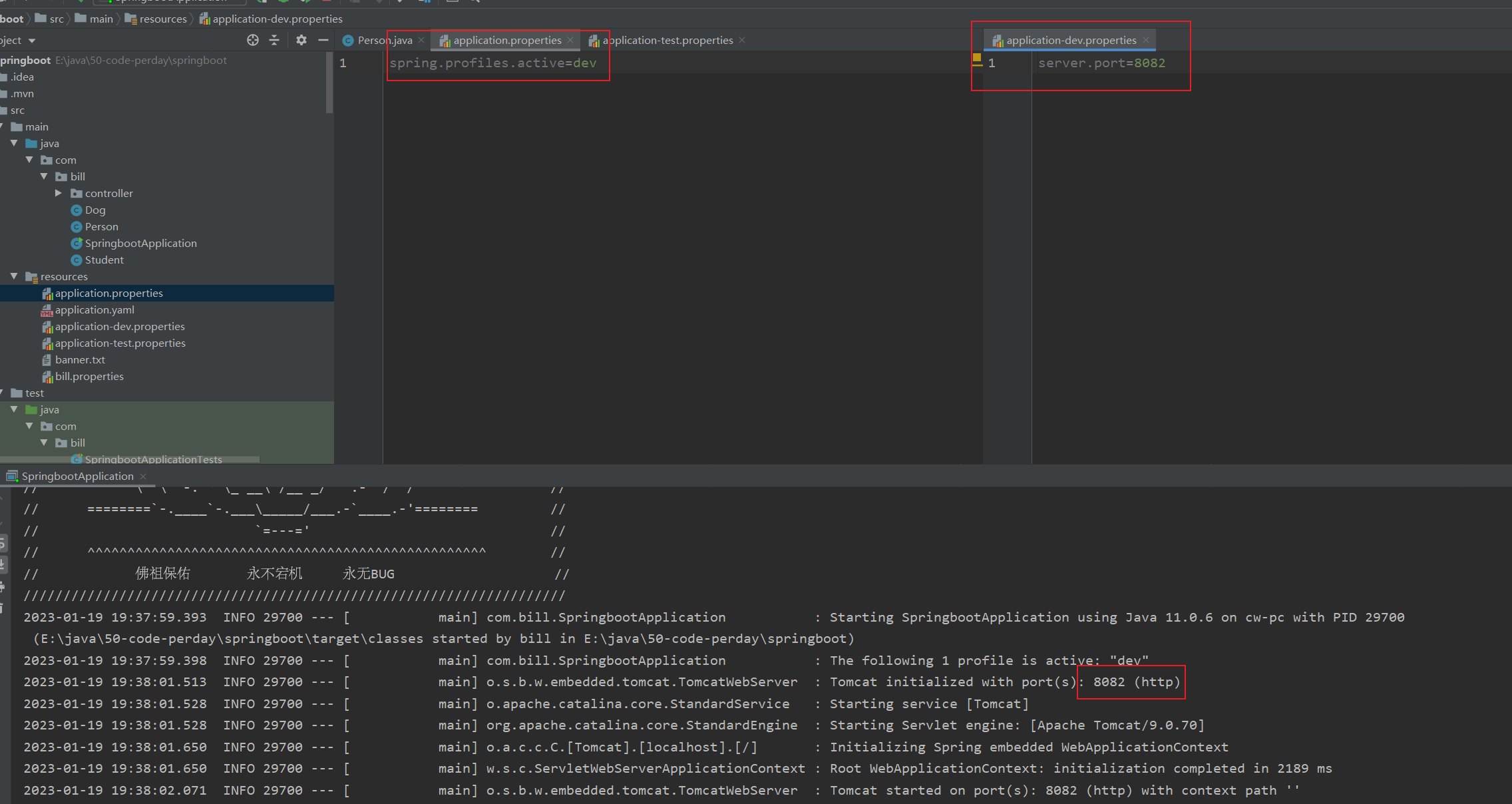 注意:如果yml和properties同时都配置了端口,并且没有激活其他环境 , 默认会使用properties配置文件的!