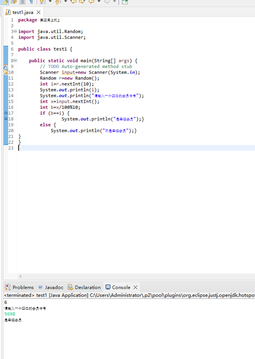 7。输入一个4位会员卡号,如果百位数字是随机数,就输出是幸运会员,否则就输出不是.