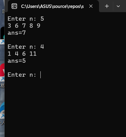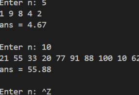 #include <stdio.h> #define N 100 void input(int x[], int n); double median(int x[], int n); int main() { int x[N]; int n; double ans; while (printf("Enter n: "), scanf_s("%d",&n) != EOF) { input(x, n); ans = median(x, n); printf("ans=%g\n\n", ans); } return 0; } void input(int x[], int n) { int i,k; int w; for (i = 0; i < n;++i) { scanf_s("%d", &x[i]); } for (i = 0; i < n - 1; ++i) { for (k = 0; k<n-i-1; ++k) { if (x[i] > x[i + 1]) { w = x[i]; x[i] = x[i + 1]; x[i + 1] = w; } } } } double median(int x[], int n) { double ans; if (n % 2 == 0) { ans = (x[n / 2] + x[n / 2 - 1]) / 2; } else { ans = x[(n - 1) / 2]; } return ans; }