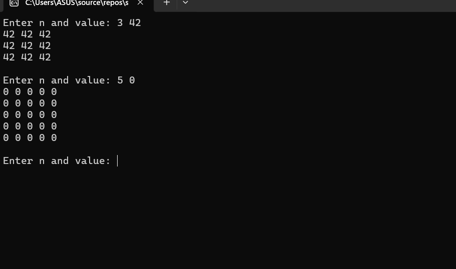 #include <stdio.h> #define N 100 // 函数声明 void output(int x[][N], int n); void init(int x[][N], int n, int value); int main() { int x[N][N]; int n, value; while (printf("Enter n and value: "), scanf_s("%d%d", &n, &value) != EOF) { init(x, n, value); // 函数调用 output(x, n); // 函数调用 printf("\n"); } return 0; } // 函数定义 void output(int x[][N], int n) { int i, j; for (i = 0; i < n; ++i) { for (j = 0; j < n; ++j) printf("%d ", x[i][j]); printf("\n"); } } // 函数定义 void init(int x[][N], int n, int value) { int i, j; for (i = 0; i < n; ++i) for (j = 0; j < n; ++j) x[i][j] = value; }