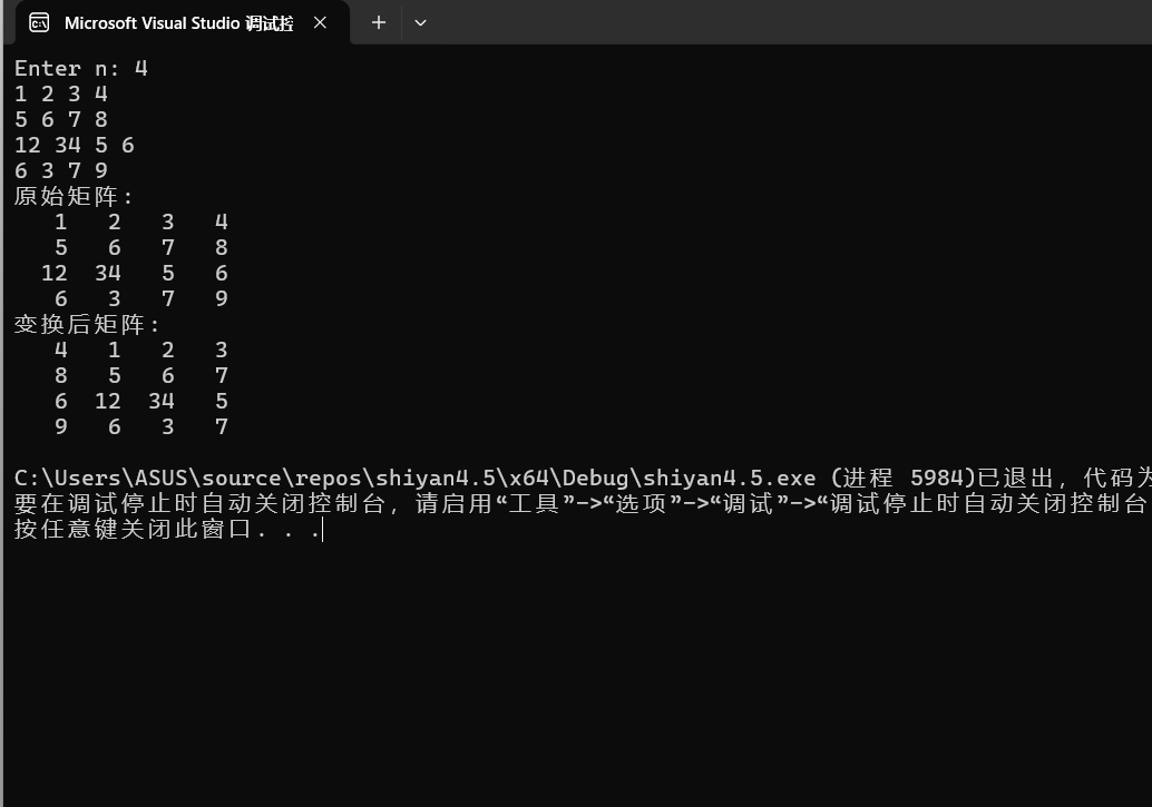 #include <stdio.h> #define N 100 // 函数声明 void input(int x[][N], int n); void output(int x[][N], int n); void rotate_to_right(int x[][N], int n); // 函数rotate_to_right声明 // 待补足 // ××× int main() { int x[N][N]; int n; printf("Enter n: "); scanf_s("%d", &n); input(x, n); printf("原始矩阵:\n"); output(x, n); // 函数rotate_to_right调用 rotate_to_right(x, n); printf("变换后矩阵:\n"); output(x, n); return 0; } // 函数定义 // 功能: 输入一个n*n的矩阵x void input(int x[][N], int n) { int i, j; for (i = 0; i < n; ++i) { for (j = 0; j < n; ++j) scanf_s("%d", &x[i][j]); } } // 函数定义 // 功能: 输出一个n*n的矩阵x void output(int x[][N], int n) { int i, j; for (i = 0; i < n; ++i) { for (j = 0; j < n; ++j) printf("%4d", x[i][j]); printf("\n"); } } void rotate_to_right(int x[][N], int n) { int y[N]; int i, j; for (i = 0; i < n; ++i) { for (j = n - 1; j >= 0; --j) { if (j == n - 1) { y[i] = x[i][j]; x[i][j] = x[i][j-1]; } else if (j == 0) { x[i][j] = y[i]; } else { x[i][j] = x[i][j-1]; } } } }