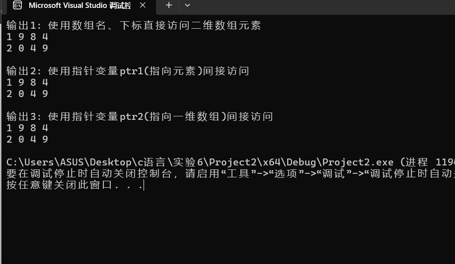 #include <stdio.h> int main() { int x[2][4] = {{1, 9, 8, 4}, {2, 0, 4, 9}}; int i, j; int *ptr1; // 指针变量,存放int类型数据的地址 int(*ptr2)[4]; // 指针变量,指向包含4个int元素的一维数组 printf("输出1: 使用数组名、下标直接访问二维数组元素\n"); for (i = 0; i < 2; ++i) { for (j = 0; j < 4; ++j) printf("%d ", x[i][j]); printf("\n"); } printf("\n输出2: 使用指针变量ptr1(指向元素)间接访问\n"); for (ptr1 = &x[0][0], i = 0; ptr1 < &x[0][0] + 8; ++ptr1, ++i) { printf("%d ", *ptr1); if ((i + 1) % 4 == 0) printf("\n"); } printf("\n输出3: 使用指针变量ptr2(指向一维数组)间接访问\n"); for (ptr2 = x; ptr2 < x + 2; ++ptr2) { for (j = 0; j < 4; ++j) printf("%d ", *(*ptr2 + j)); printf("\n"); } return 0; }
