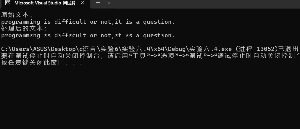#include <stdio.h> #define N 80 void replace(char *str, char old_char, char new_char); // 函数声明 int main() { char text[N] = "Programming is difficult or not, it is a question."; printf("原始文本: \n"); printf("%s\n", text); replace(text, 'i', '*'); // 函数调用 注意字符形参写法,单引号不能少 printf("处理后文本: \n"); printf("%s\n", text); return 0; } // 函数定义 void replace(char *str, char old_char, char new_char) { int i; while(*str) { if(*str == old_char) *str = new_char; str++; } }